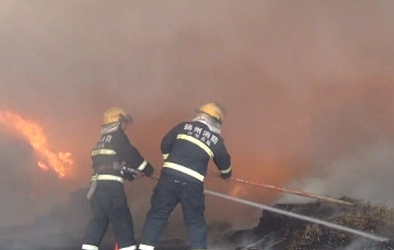 江蘇省揚州市一處堆放竹條的倉庫突然起火,風干的竹條大面積燃燒,濃煙籠罩,當?shù)叵啦块T接警,立即前往撲救。